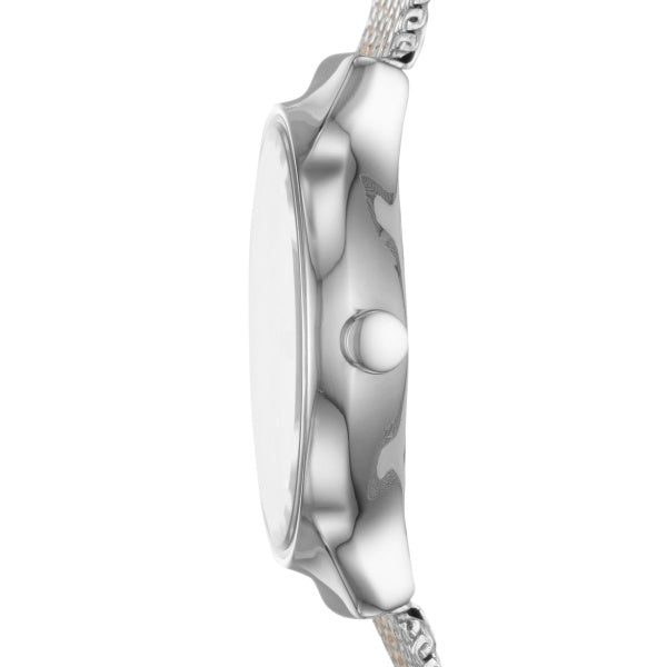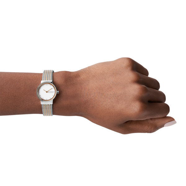 Questa Freja Lille da 26mm presenta un quadrante a sabbio con indici a cristallo e movimento a due lancelle. È rifinita con una cinghia in rete d'acciaio a righe da 12 mm. Il cinturino dell'orologio non è intercambiabile.