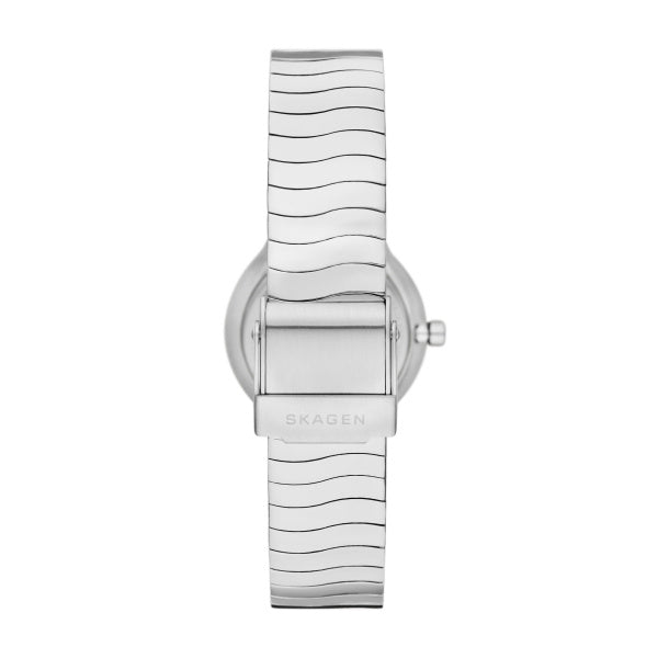 Un quadrante blu spazzolato è abbinato a un elegante braccialetto in rete in acciaio inox "S Wave" in tonalità argentata, creando un'estetica moderna e minimalista accentuata da un design pulito a due mani.