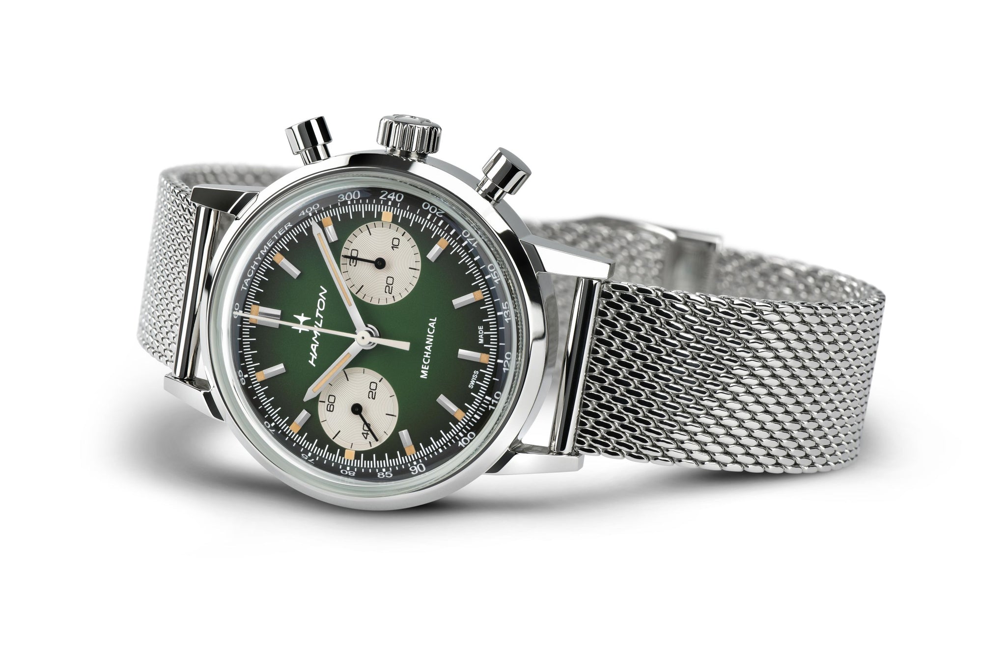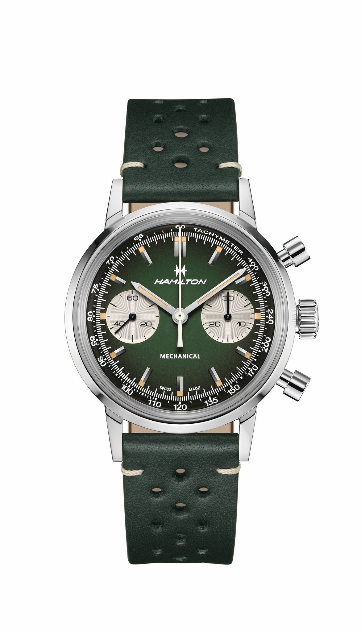 L’American Classic Chronograph 40 mm in verde intenso interpreta in chiave contemporanea l’estetica delle corse automobilistiche vintage. La finitura fumé aggiunge profondità alla tonalità intensa del quadrante, mentre il cinturino traforato rende omaggio al design classico del motorsport. Corredato da un secondo versatile bracciale in maglia fornito nella confezione, questo cronografo automatico unisce lo spirito pionieristico di Hamilton a un look pronto per la corsia di sorpasso.