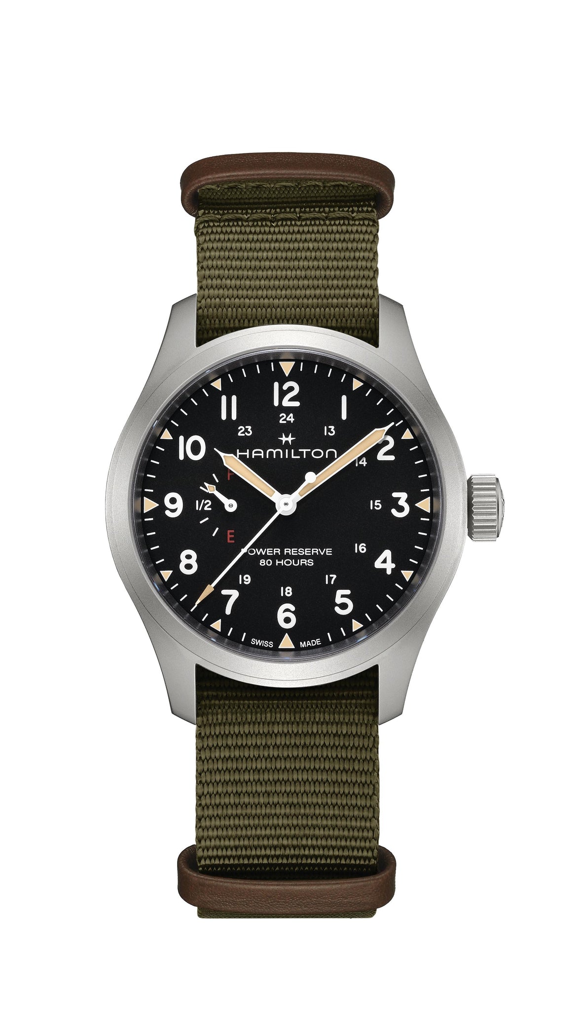 Il Khaki Field Mechanical Power Reserve 40 mm rende omaggio al design tradizionale e alla funzionalità essenziale della famiglia Khaki, introducendo al contempo caratteristiche moderne e le ultime novità in fatto di tecnologia e innovazione orologiere. Dotato di un nuovo movimento a carica manuale H-23, sviluppato da ETA in esclusiva per Hamilton, consente per la prima volta di visualizzare direttamente sul quadrante la riserva di carica di 80 ore. Abbinato a un robusto cinturino NATO verde khaki, il quadrante nero mostra le diciture “power reserve 80 hours” (“riserva di carica di 80 ore”), “F” (completamente carico) ed “E” (scarico), sottolineando questa caratteristica funzionale d’eccezione.