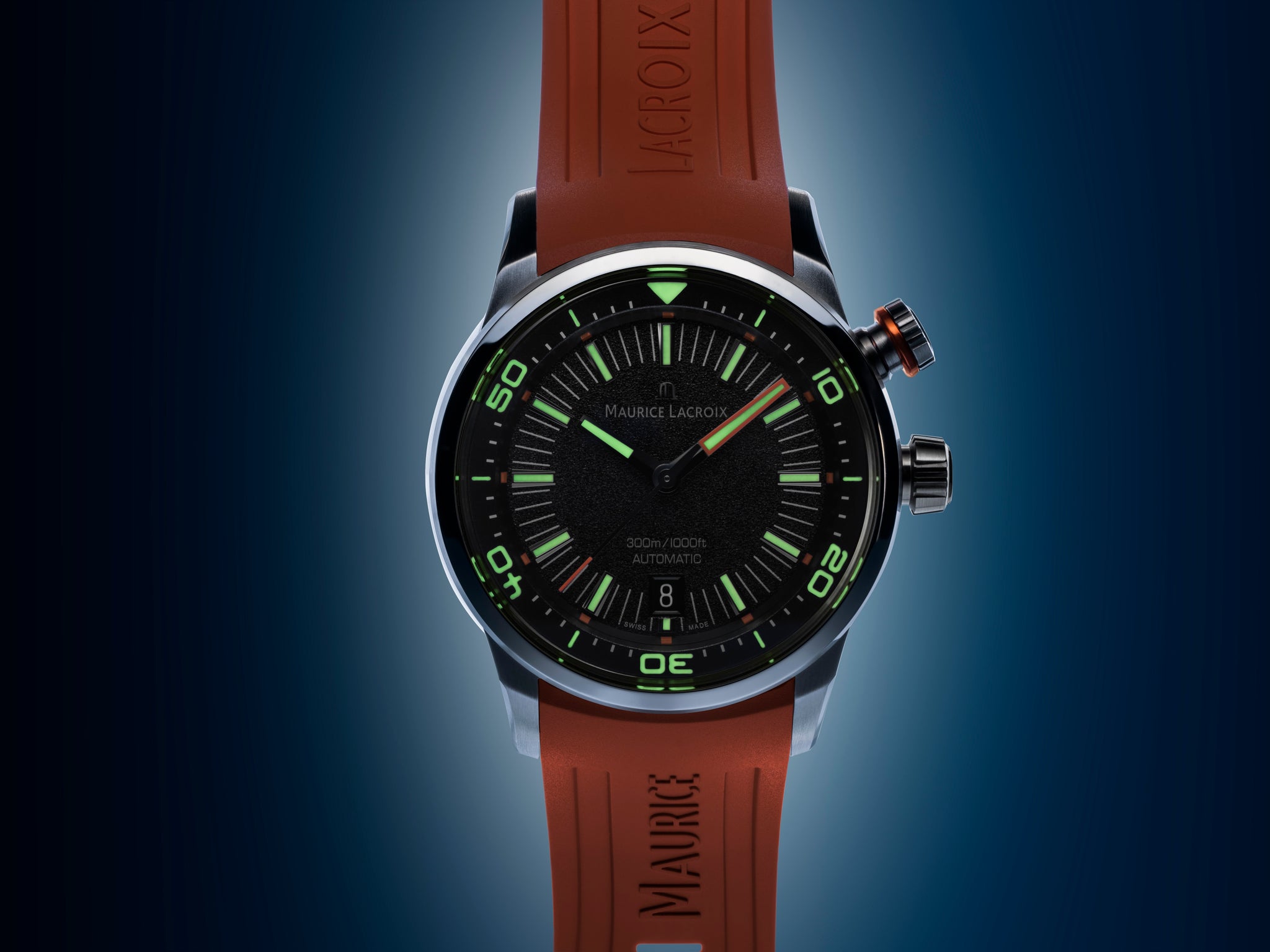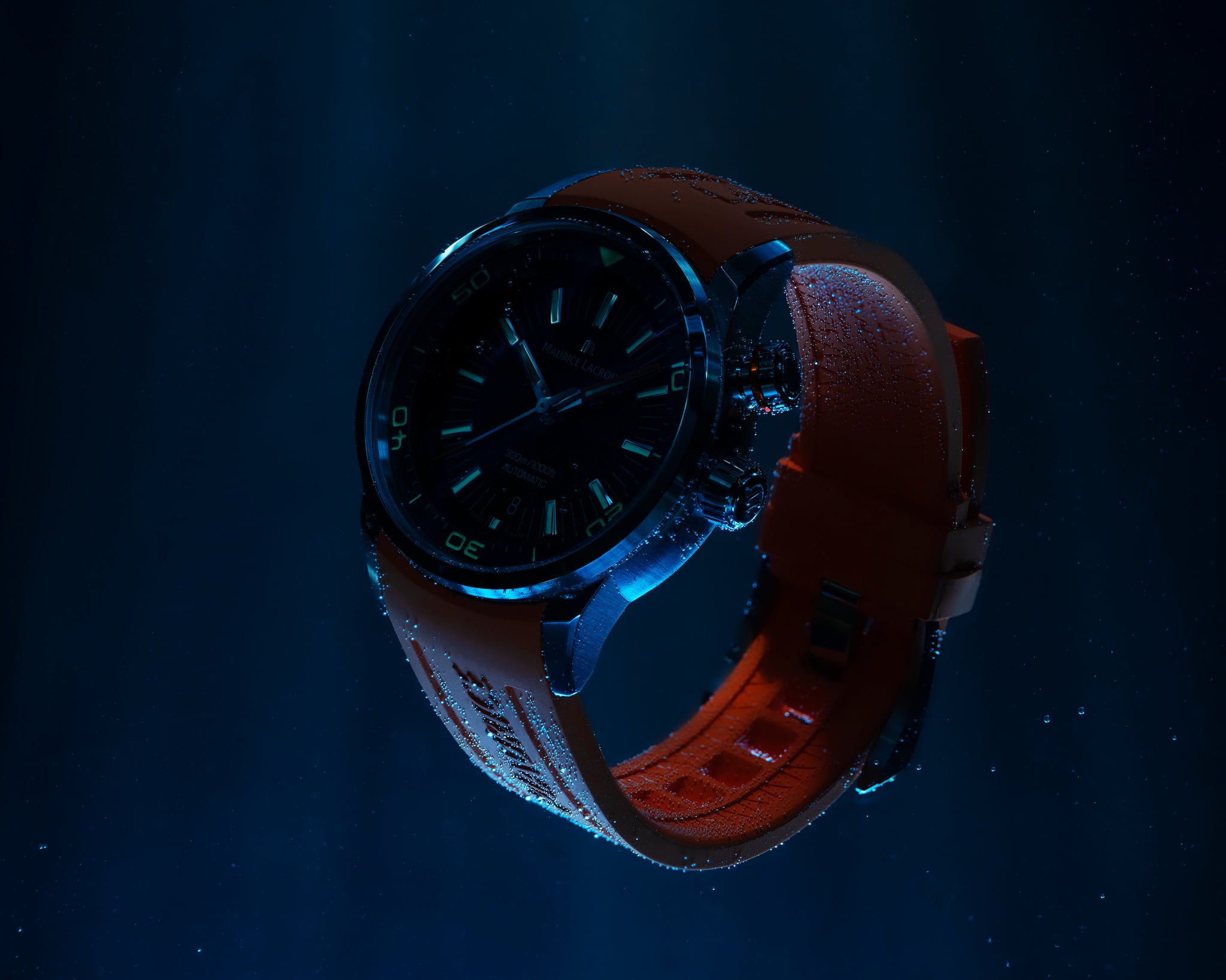 BRACCIALE/CINTURINO: Arancione, cinturino in caucciù, reca il nome "Maurice Lacroix"