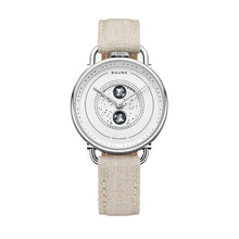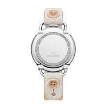 This Baume timepiece features a round polished steel case with a crown at 12 o’clock, articulated horns and a interchangeable strap system with a button. This timepiece feature a mat white dial adorned with a unique moon phase disc. It is mounted on a linen strap.