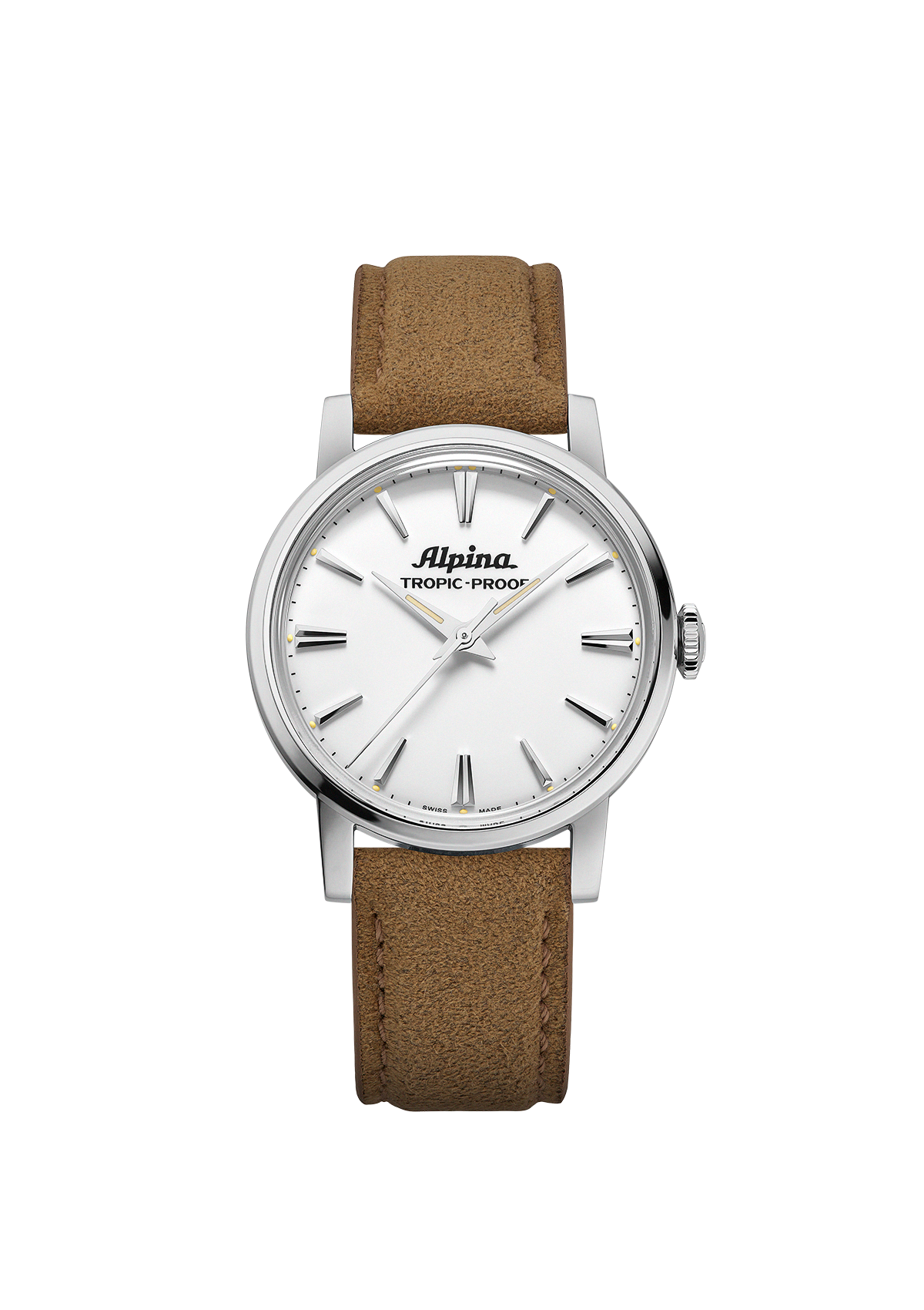 Il nuovo Alpina Heritage Tropic-Proof è una replica meticolosa del modello del 1965 (cassa da 34 mm, movimento manuale AL-480). L'estetica vintage (lancette dauphine, indici distintivi) è rispettata, con materiali moderni (vetro zaffiro). Unisce il fascino del passato alla qualità orologiera contemporanea, offrendo un'immersione nella storia di Alpina.